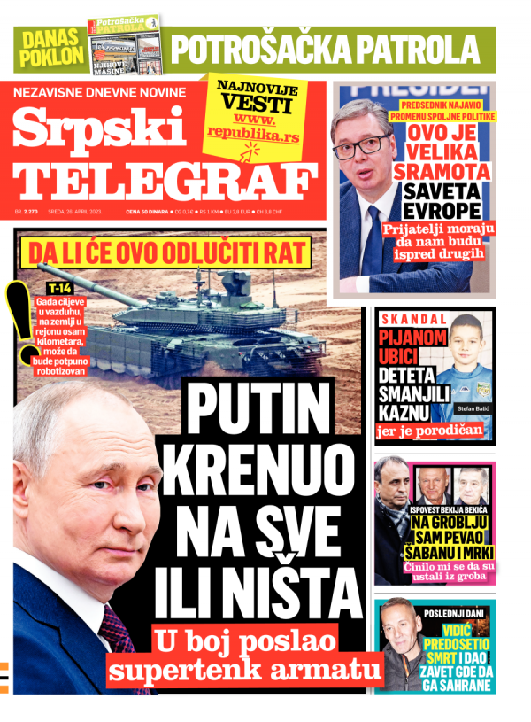Naslovna strana Srpskog telegrafa za 26.04.2023.
