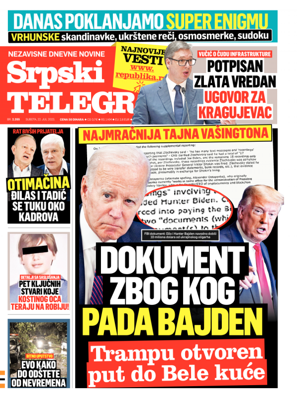 Naslovna strana Srpskog telegrafa za 22.07.2023.
