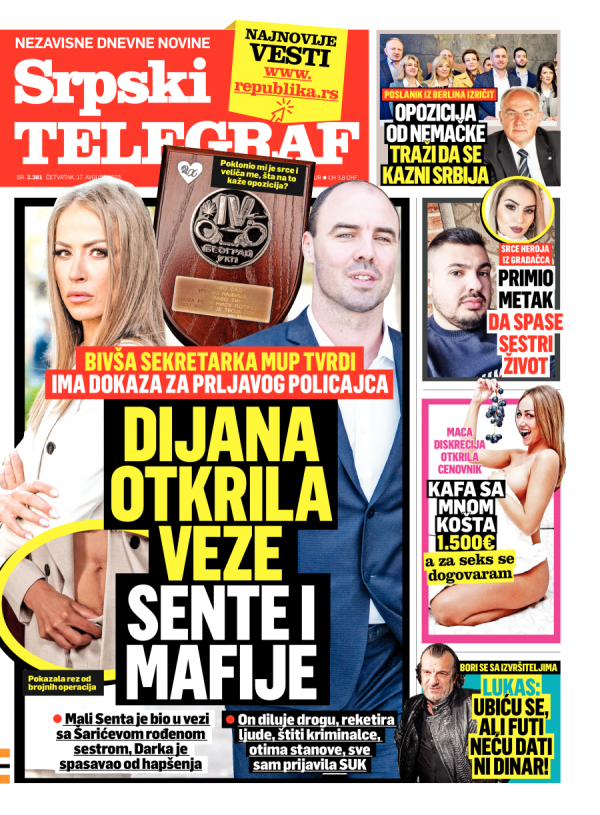 Naslovna strana Srpskog telegrafa za 17.08.2023.
