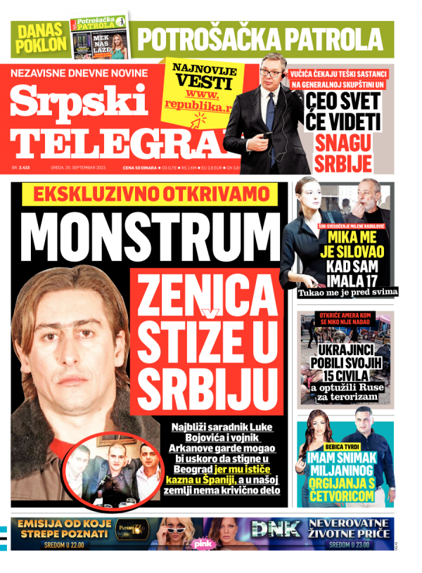 Naslovna strana Srpskog telegrafa za 20.09.2023.