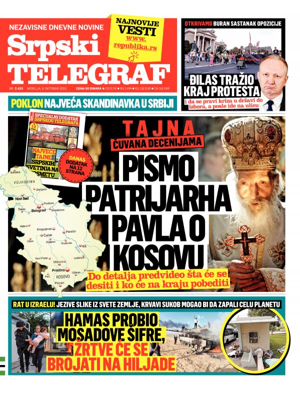 Naslovna strana Srpskog telegrafa za 08.10.2023.