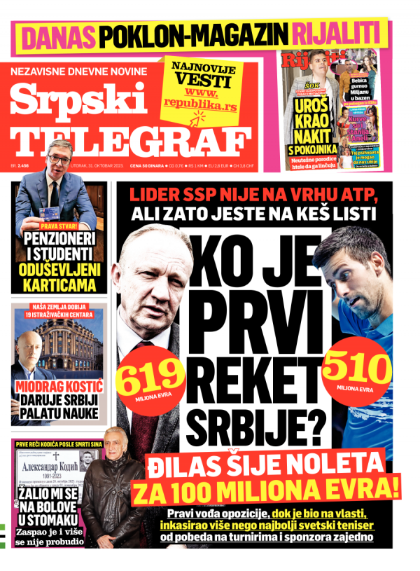 Naslovna strana Srpskog telegrafa za 31.10.2023.