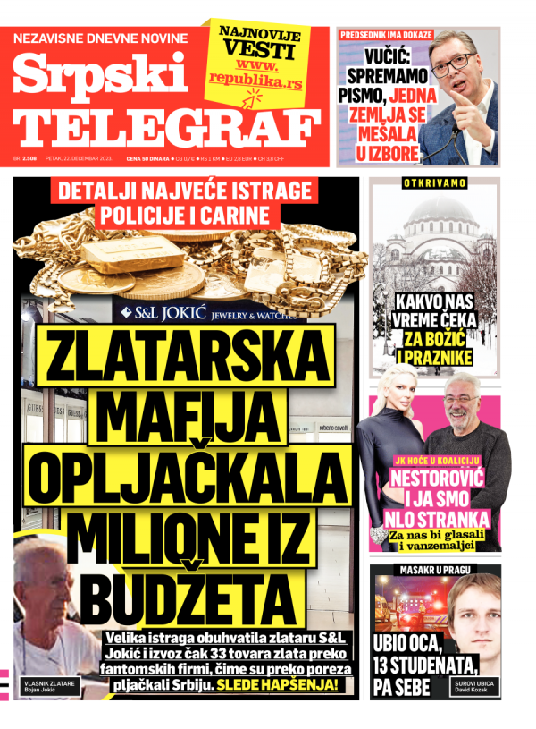Naslovna strana Srpskog telegrafa za 22.12.2023.