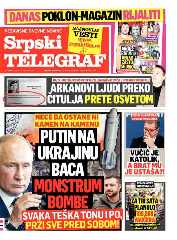 Naslovna strana Srpskog telegrafa za 16.01.2024.