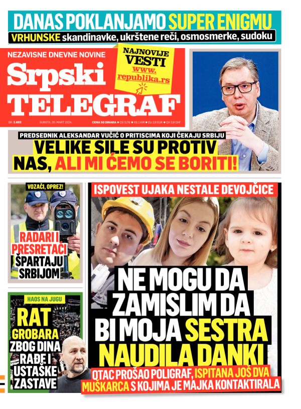 Naslovna strana Srpskog telegrafa za 30.03.2024.