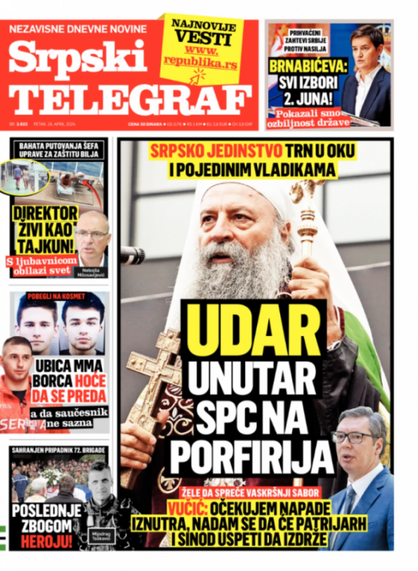 Naslovna strana Srpskog telegrafa za 19.04.2024.