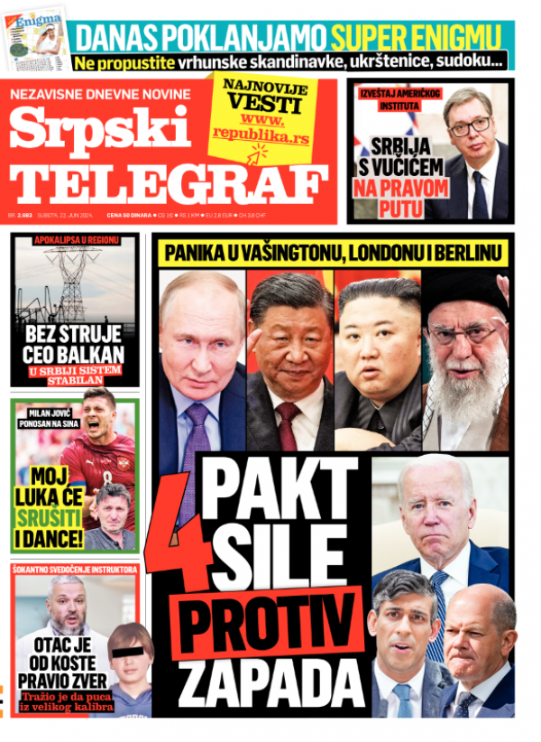Naslovna strana Srpskog telegrafa za 22.06.2024.