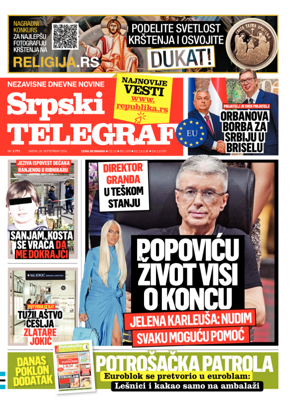 Naslovna strana Srpskog telegrafa za 18.09.2024.