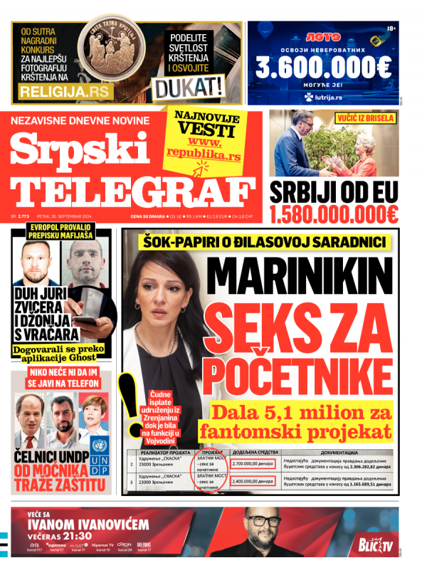 Naslovna strana Srpskog telegrafa za 20.09.2024.