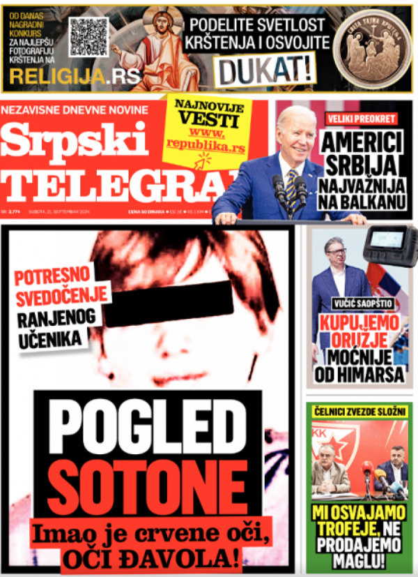 Naslovna strana Srpskog telegrafa za 21.09.2024.