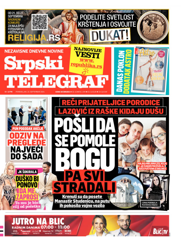 Naslovna strana Srpskog telegrafa za 23.09.2024.