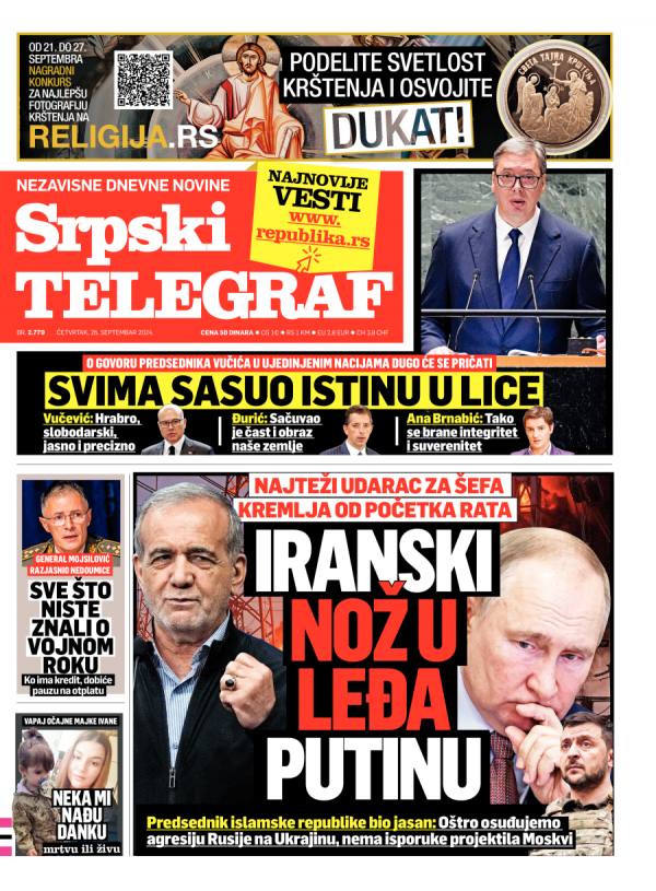 Naslovna strana Srpskog telegrafa za 26.09.2024.