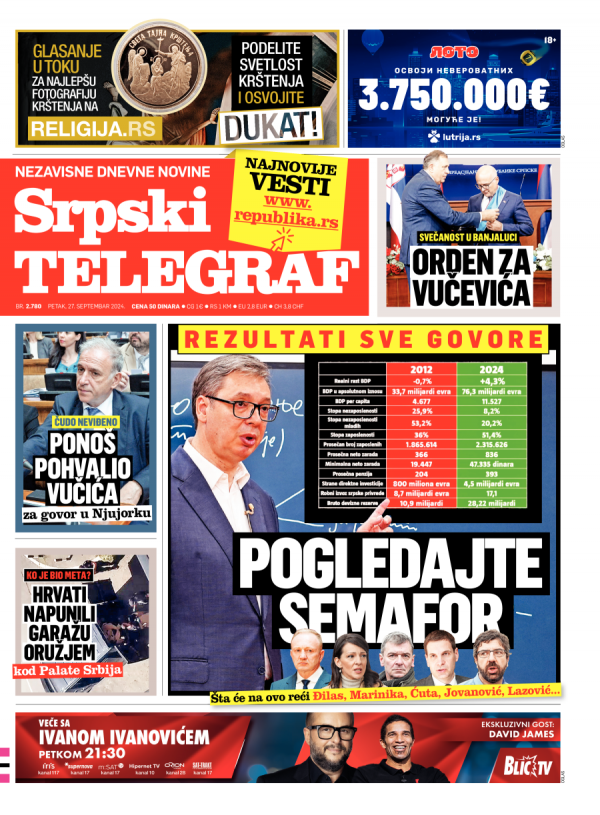Naslovna strana Srpskog telegrafa za 27.09.2024.