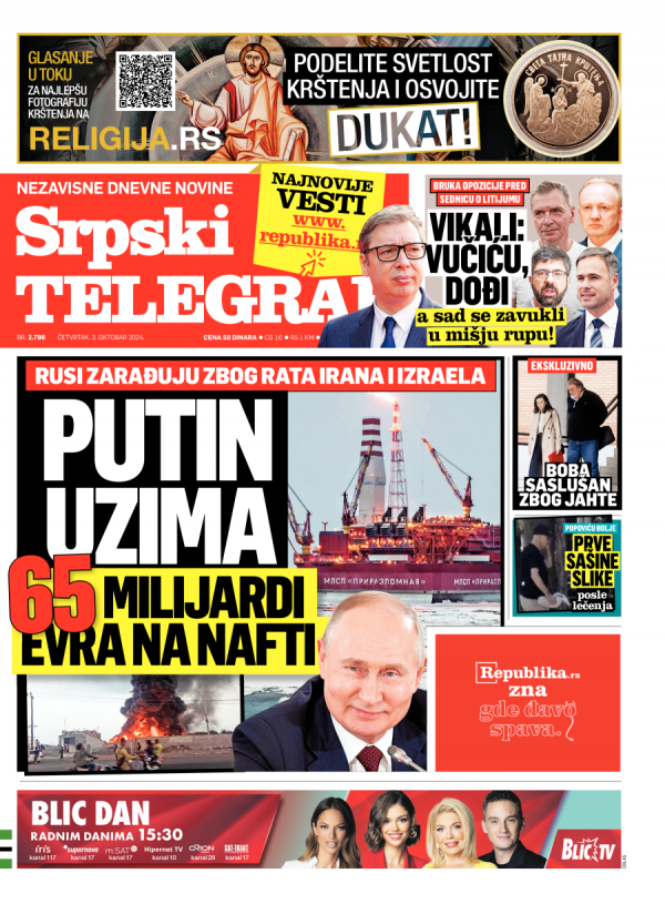 Naslovna strana Srpskog telegrafa za 03.10.2024.
