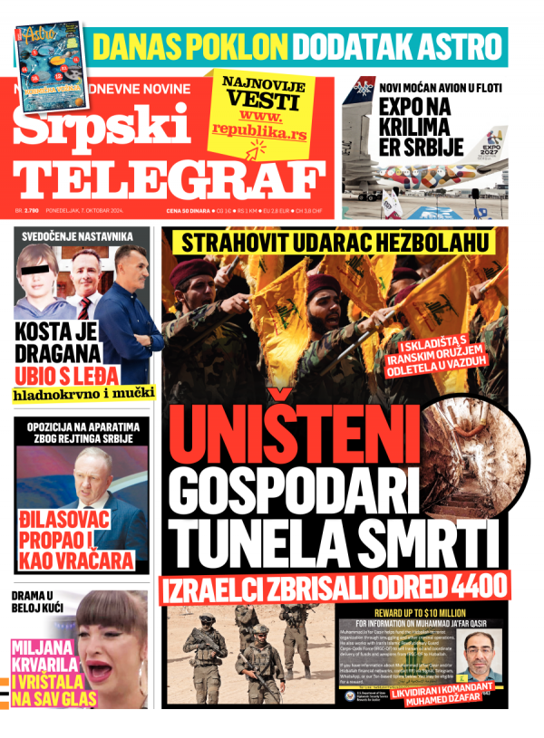 Naslovna strana Srpskog telegrafa za 07.10.2024.