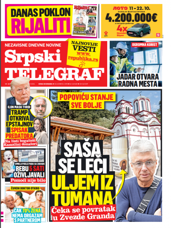 Naslovna strana Srpskog telegrafa za 15.10.2024.