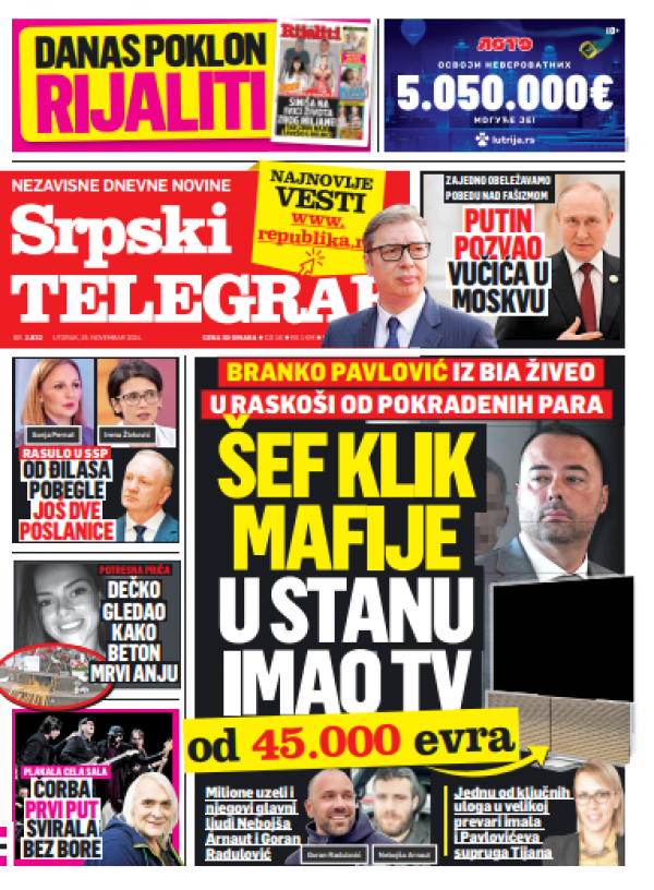 Naslovna strana Srpskog telegrafa za 19.11.2024.