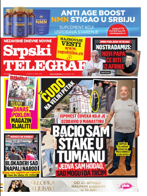 Naslovna strana Srpskog telegrafa za 22.04.2025.