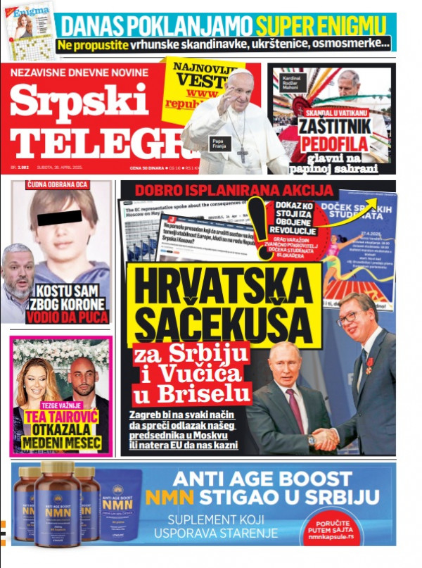 Naslovna strana Srpskog telegrafa za 26.04.2025.