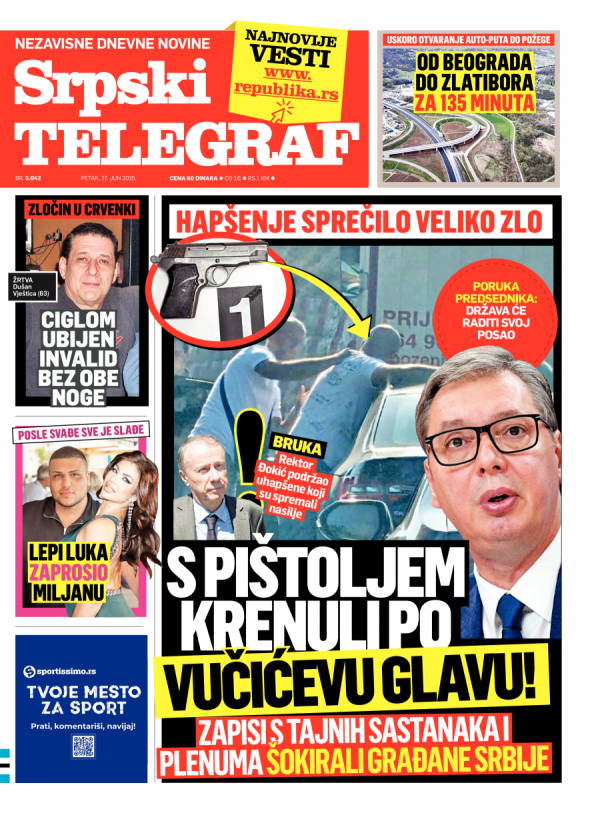 Naslovna strana Srpskog telegrafa za 27.06.2025.