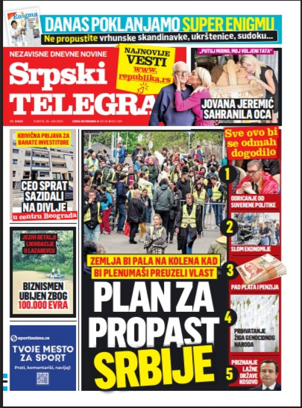 Naslovna strana Srpskog telegrafa za 28.06.2025.