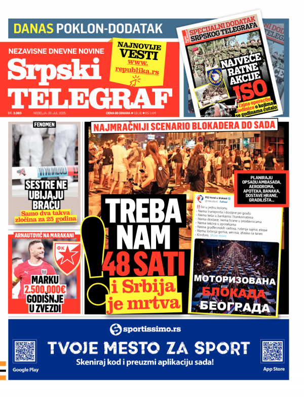 Naslovna strana Srpskog telegrafa za 20.07.2025.