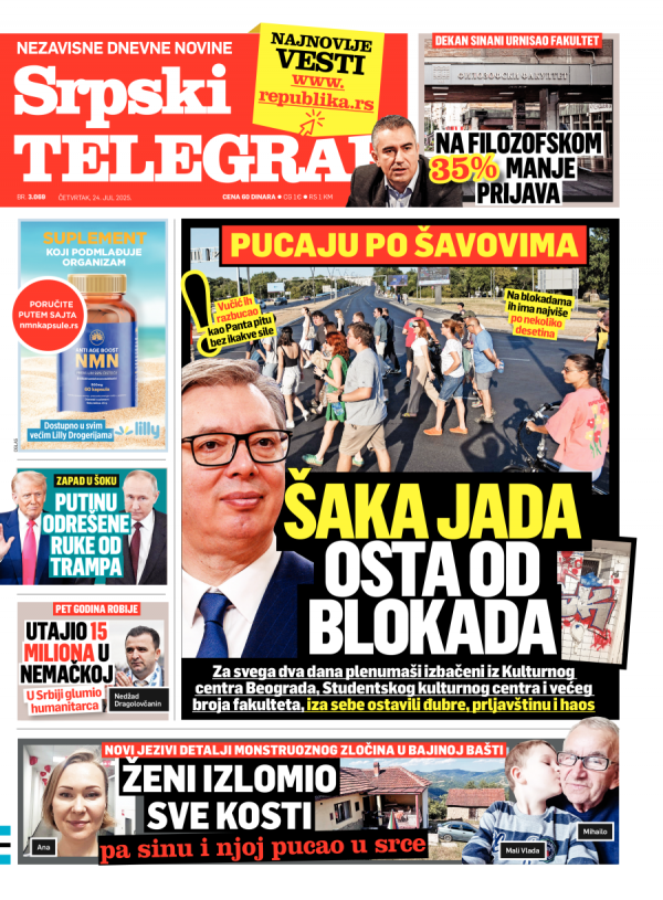 Naslovna strana Srpskog telegrafa za 24.07.2025.