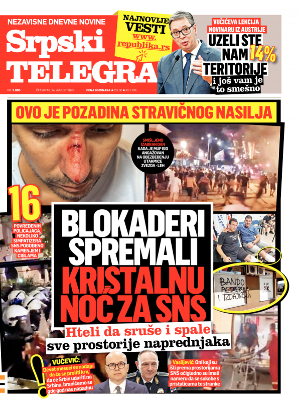 Naslovna strana Srpskog telegrafa za 14.08.2025.
