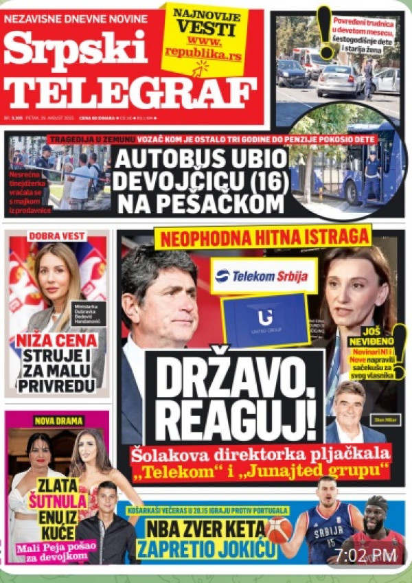 Naslovna strana Srpskog telegrafa za 29.08.2025.