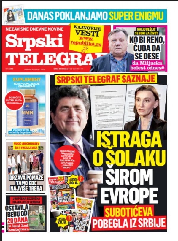 Naslovna strana Srpskog telegrafa za 30.08.2025.