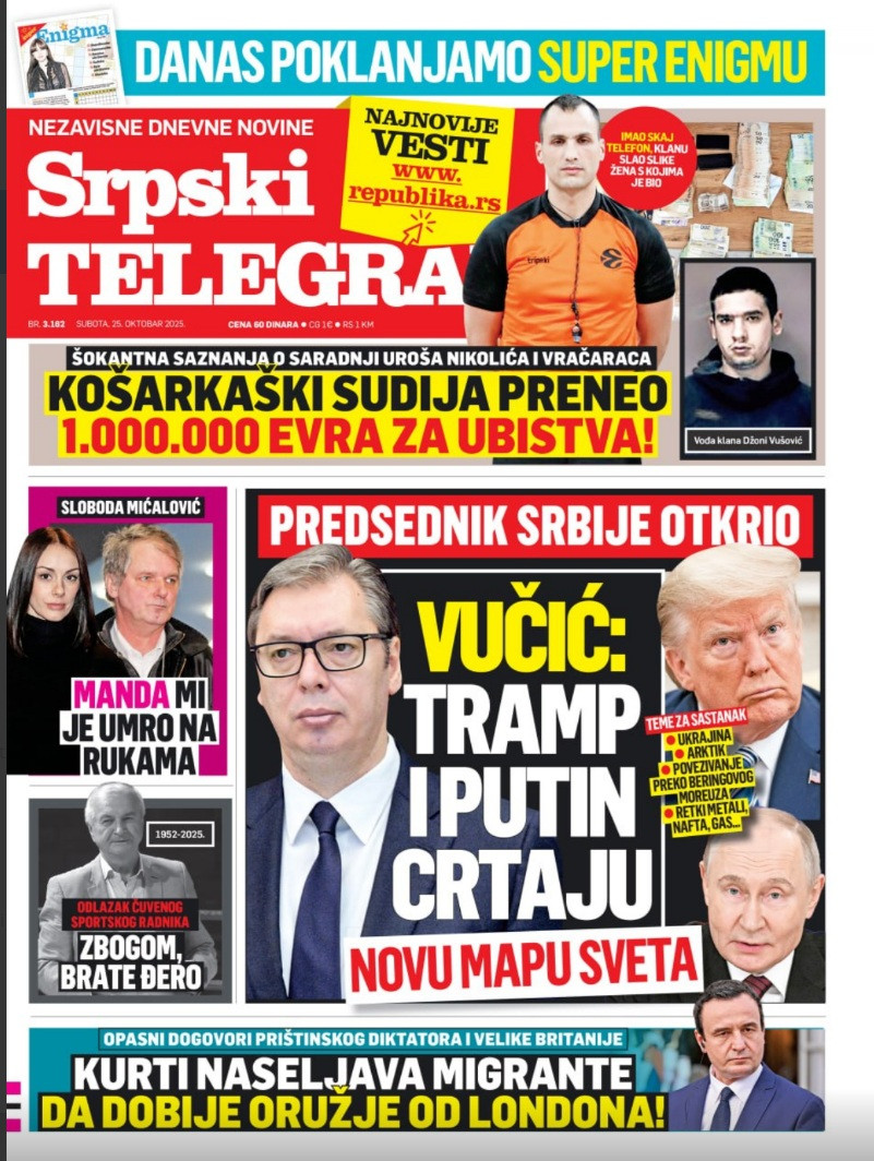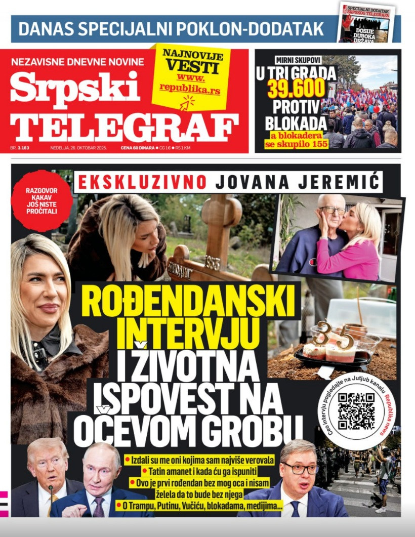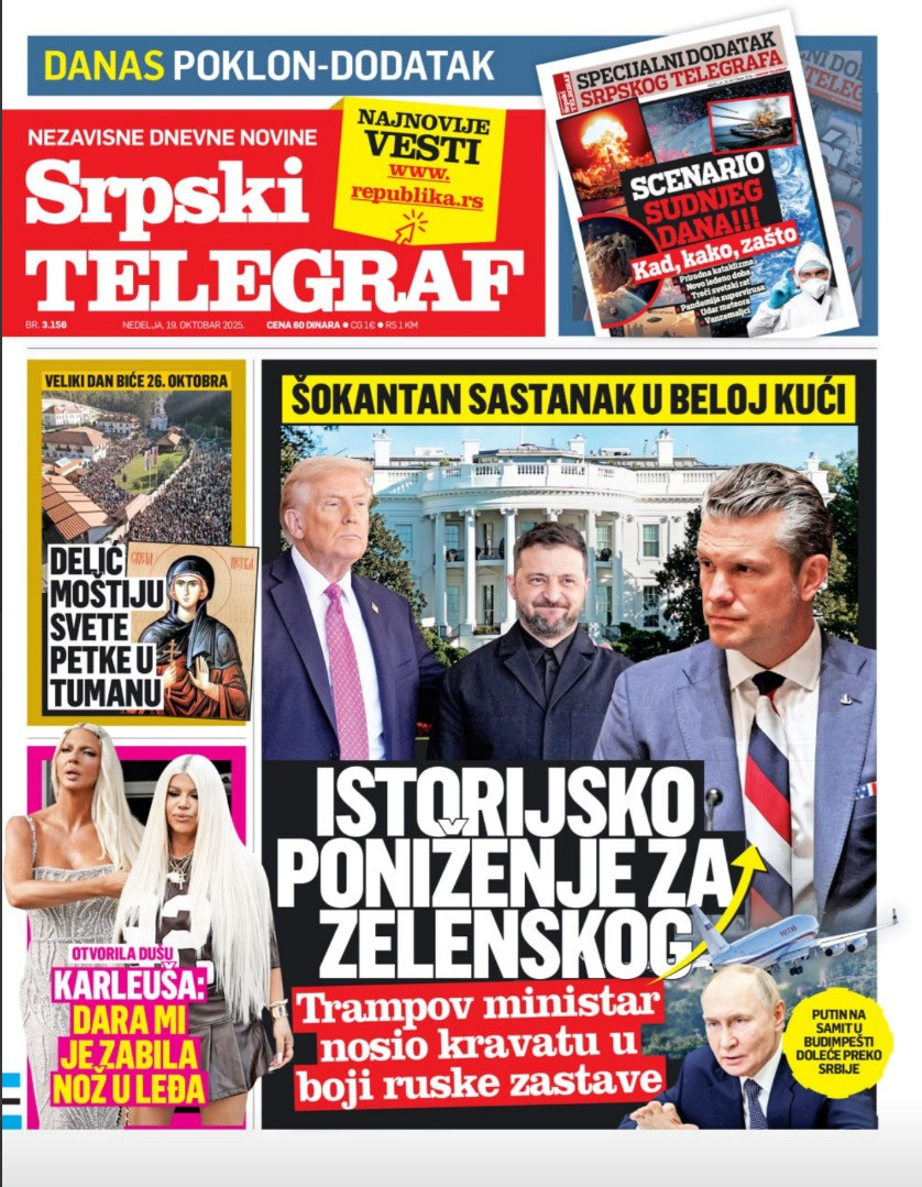 Naslovna strana Srpskog telegrafa za 22.09.2025.