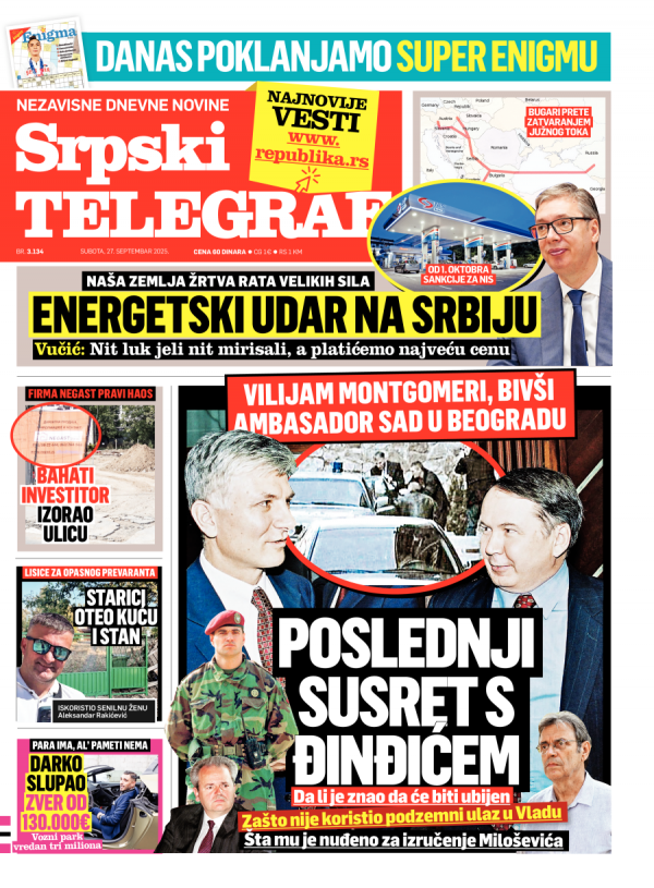 Naslovna strana Srpskog telegrafa za 27.09.2025.