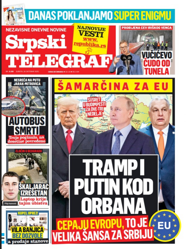 Naslovna strana Srpskog telegrafa za 18.10.2025.