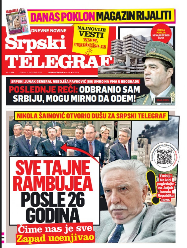 Naslovna strana Srpskog telegrafa za 21.10.2025.