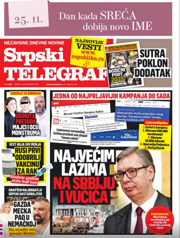 Naslovna strana Srpskog telegrafa za 22.11.2025.