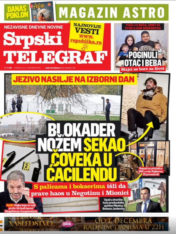Naslovna strana Srpskog telegrafa za 01.12.2025.