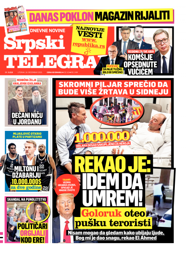 Naslovna strana Srpskog telegrafa za 16.12.2025.