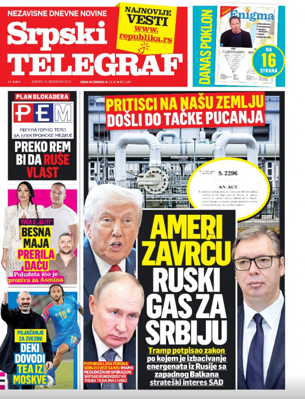 Naslovna strana Srpskog telegrafa za 20.12.2025.