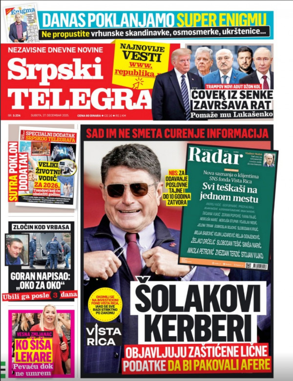Naslovna strana Srpskog telegrafa za 27.12.2025.