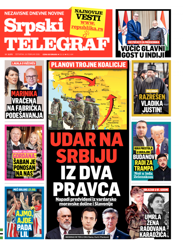 Naslovna strana Srpskog telegrafa za 19.02.2026.