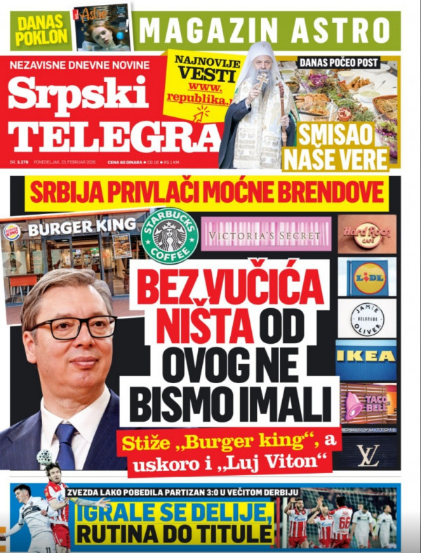 Naslovna strana Srpskog telegrafa za 23.02.2026.