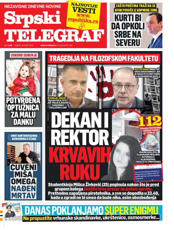 Naslovna strana Srpskog telegrafa za 28.03.2026.
