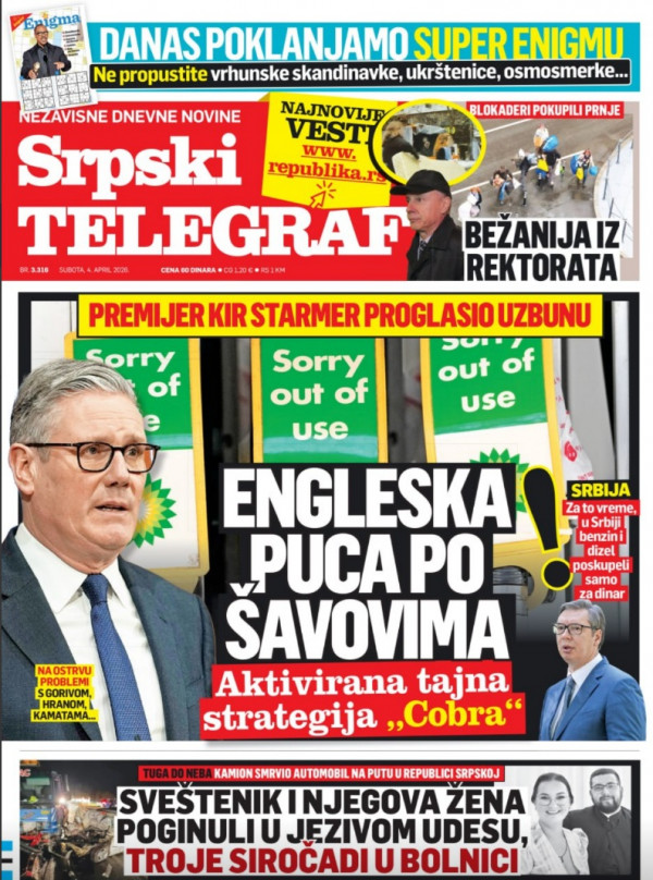 Naslovna strana Srpskog telegrafa za 04.04.2026.