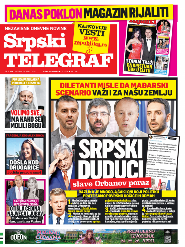 Naslovna strana Srpskog telegrafa za 14.04.2026.