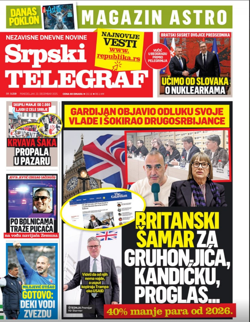 Naslovna strana Srpskog telegrafa za 29.01.2020.