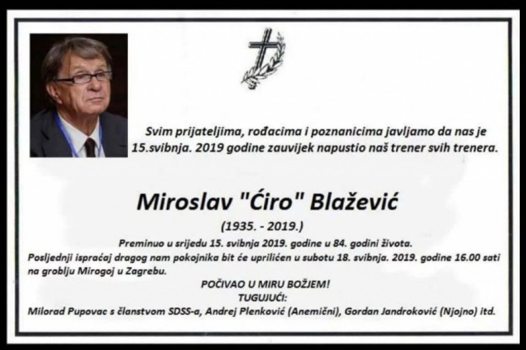 Nakon što je Ćiro Blažević objavio da je snimio predizborni spot u znak podrške Samostalnoj demokratskoj stranci Srba u Hrvatskoj i Miloradu Pupovcu, društvenim mrežama se širi umrlica sa likom i imenom ovog bivšeg fudbalskog trenera.