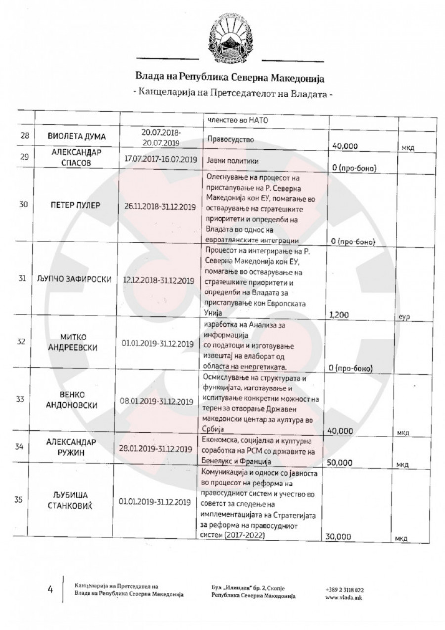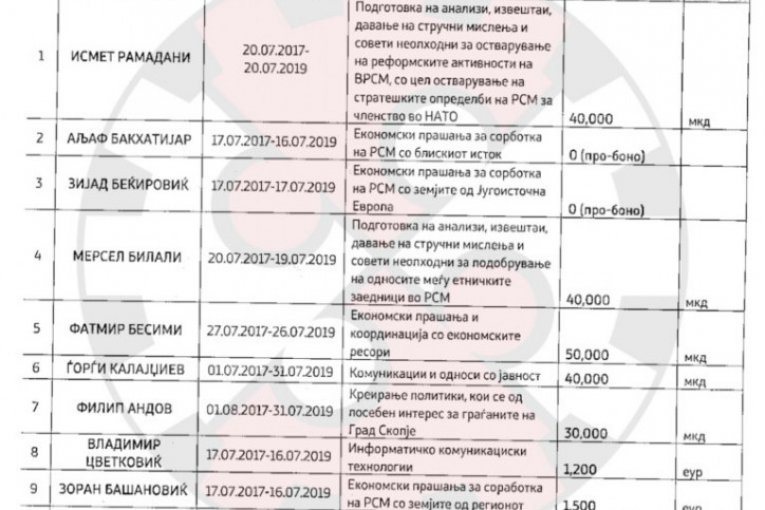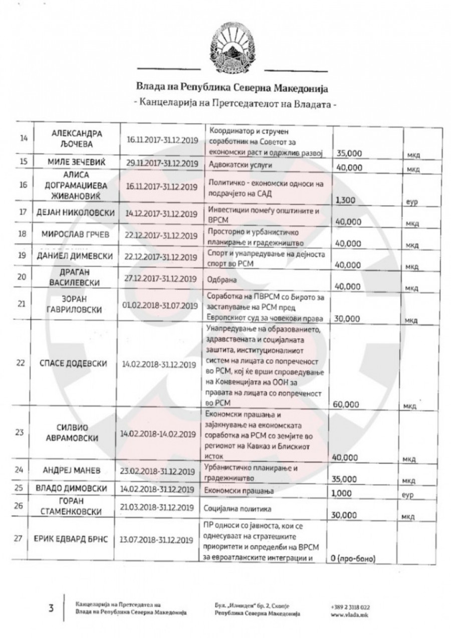 Zaev ima ukupno 39 spoljnih savetnika iz skoro svih oblasti - od ekonomije, diplomatije, zdravstvene zaštite, regionalne politike, društvenih poslova, sporta, odnosa sa javnošću itd. Među njima su istaknuti domaći i međunarodni profesionalci, ali i kontroverzni zaposleni.