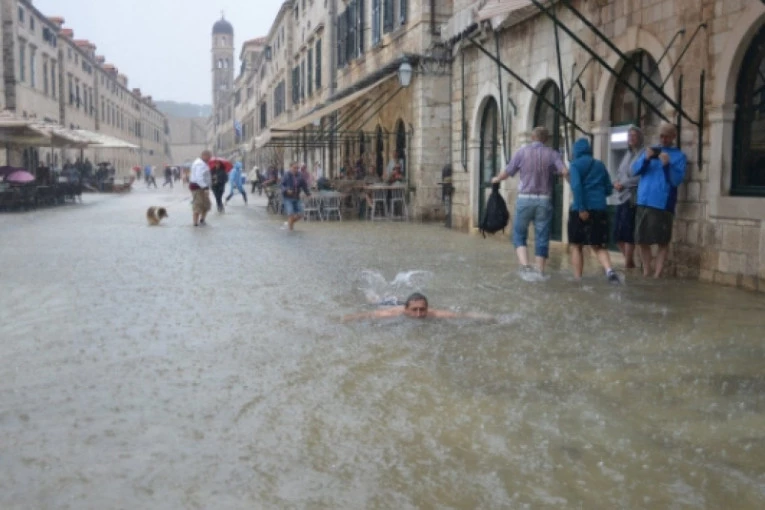 Obilna kiša i poplavljene ulice inspirisale su jednog češkog turistu da organizuje "trku oko Orlanda" i zapliva Stradunom koji je, kako se navodi, zbog jake kiše postao bazen.