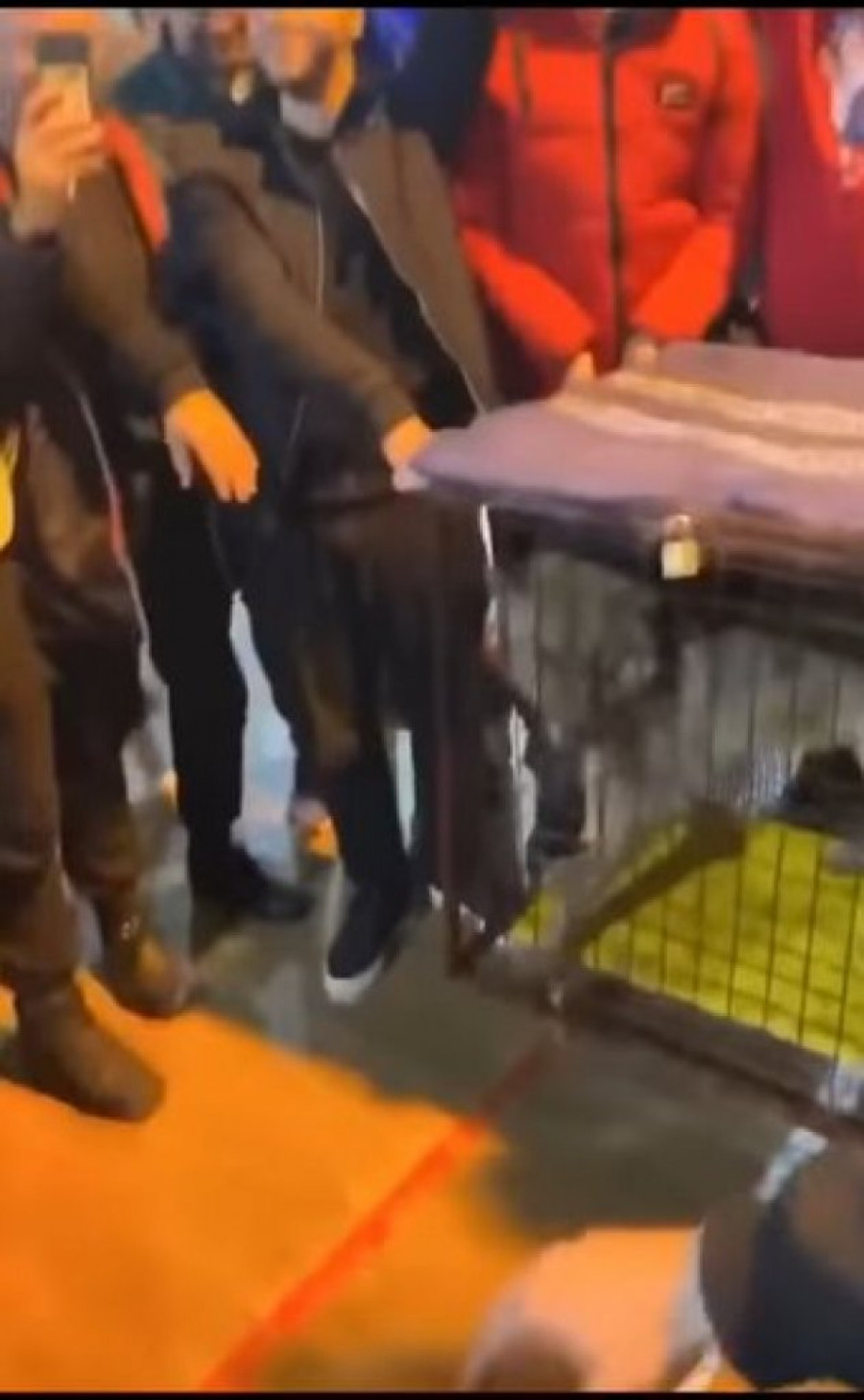 Na snimku koji se proširio društvenim mrežama vidi se kako nekoliko muškaraca donosi kavez sa životinjom pred prepunu salu, kao i muškarac koji pokušava da sedne na kavez dok okupljeni viču i navijaju, dok se životinja preplašeno grči i vrti u krug.