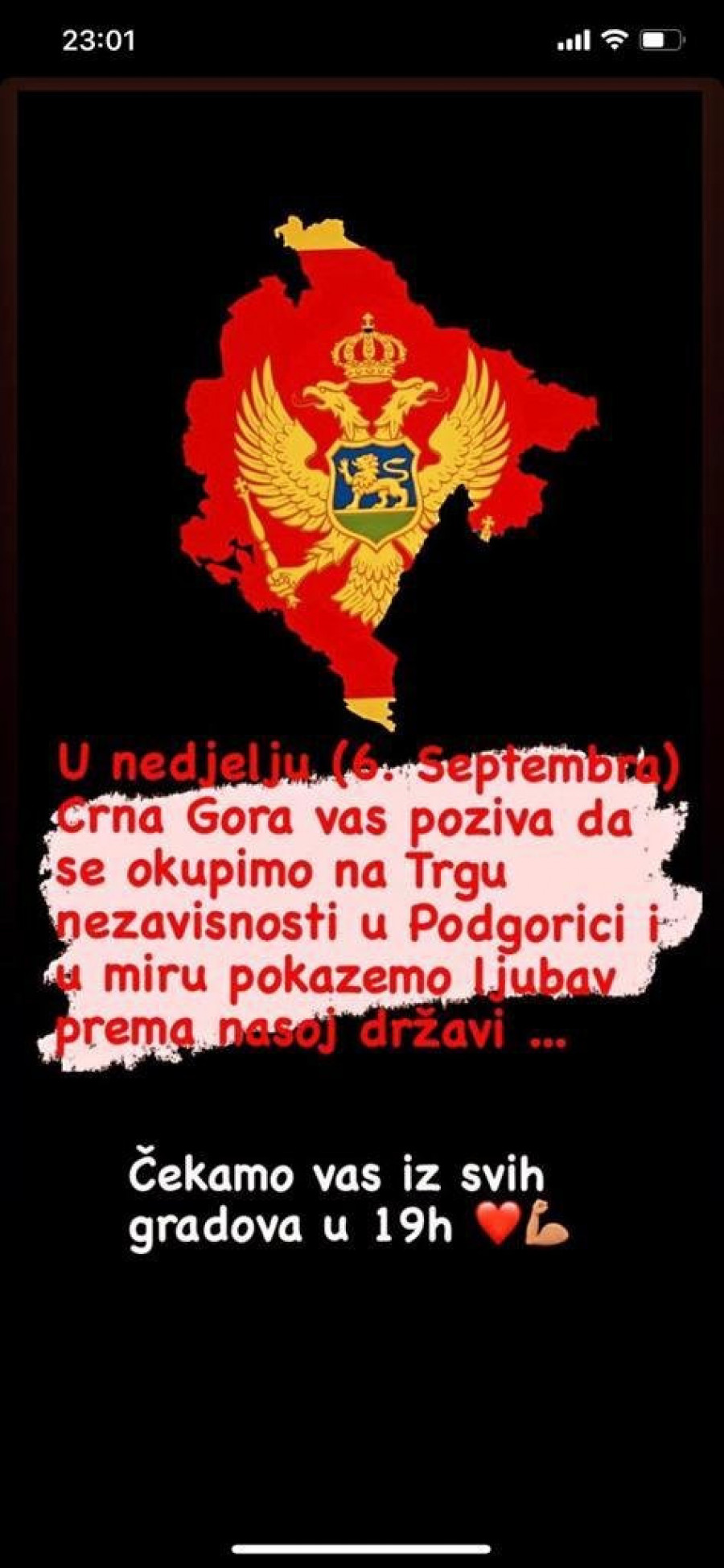 Preko društvenih mreža i privatnih poruka, građanima Crne Gore upućen je poziv da se okupe u nedelju, 6. septembra, na Trgu nezavisnosti u Podgorici, kako bi izrazili "ljubav" prema Crnoj Gori.
